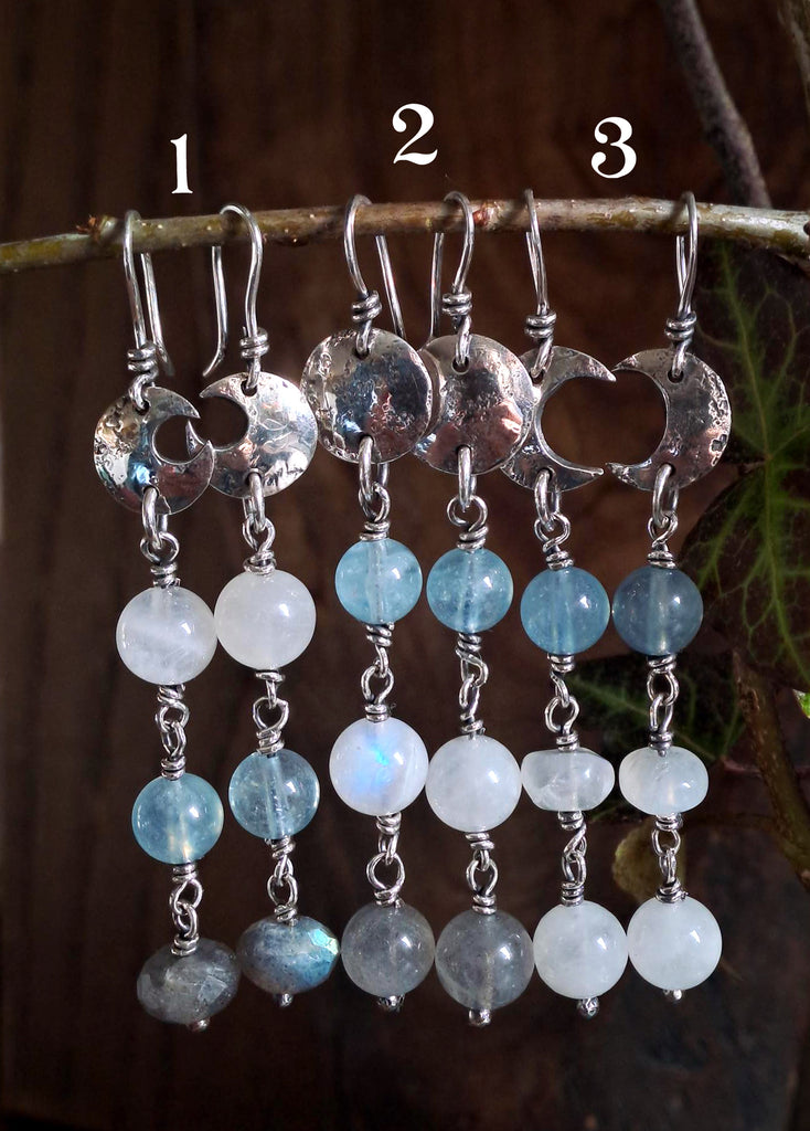 No.1 - 3/4 sterling silver moon, with moonstone, aquamarine and labradorite - approx. 6.5cm length from top of ear wire.